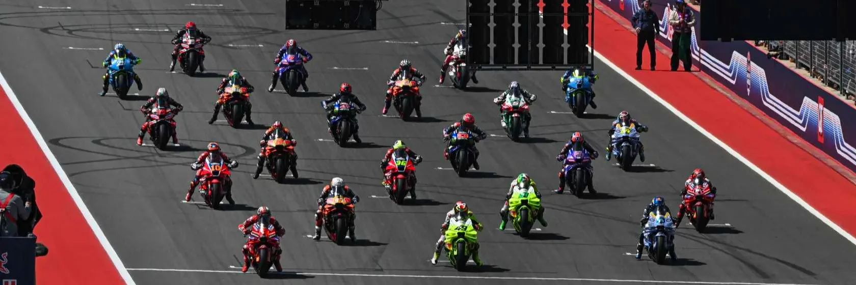 The 2025 US Grand Prix kicked off in dramatic fashion. With just minutes to go before the lights went out, polesitter Marc Márquez set off a chain reaction of the whole grid sprinting back into the pits to change bikes due to changing weather conditions and a last-minute electronic setup change. Once the race got underway, Marc stretched out a comfortable lead before a crash at Turn 4 ended his domination. Ducati teammate Francesco Bagnaia took the top step of the podium, followed by Álex Márquez and Fabio Di Giannantonio for another all-Ducati podium lockout.